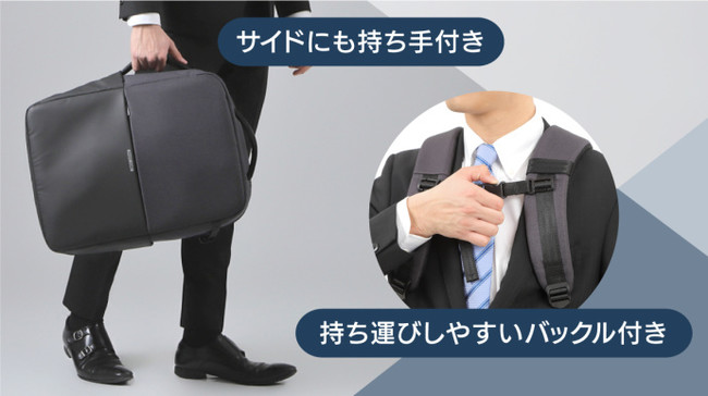 特徴5:フロント部分にバックル付きで肩からのずれ落ち防止、サイドに持ち手つきで持ち運び便利