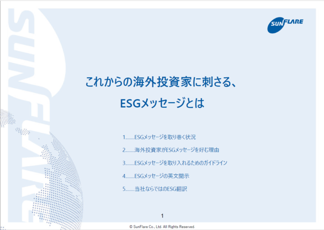 IR翻訳(海外投資家向け広報の翻訳)に多数の実績を誇る翻訳大手の株式会社サン・フレア(本社:東京都新宿区、代表取締役社長:笹井紘幸)は、近年多くの企業や世界の投資家が注目をしているESGについてのホワイトペーパーを無料公開いたしました。企業がESGメッセージを発信する重要性や海外投資家向けのポイントなどが翻訳会社の視点でまとめられており、英文開示の準備を進めるIRや広報担当者等には必見の情報となっております。