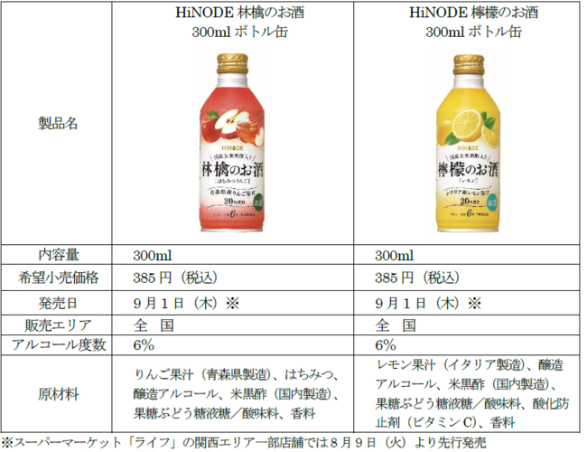 日の出みりんを手掛けるキング醸造株式会社(兵庫県加古郡稲美町、社長:大西浩介)は、リキュールの新ブランド「HiNODE」第一弾商品として「HiNODE林檎のお酒」「HiNODE檸檬のお酒」を9月1日(木)より全国にて発売いたします。また、スーパーマーケット「ライフ」の関西エリア一部店舗では8月9日(火)より先行発売いたします。名高い産地の厳選果汁を贅沢に20%使用。さらに国産玄米黒酢を絶妙にブレンドし、果汁だけでは表現できない爽やかで満足感のある味わいに仕上げた自信作です。