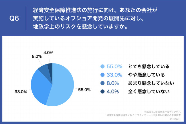 「Q6.経済安全保障推進法の施行に向け、あなたの会社が実施しているオフショア開発の展開先に対し、地政学上のリスクを懸念していますか。」(n=100)と質問したところ、「とても懸念している」が55.0%、「やや懸念している」が33.0%という回答となりました。