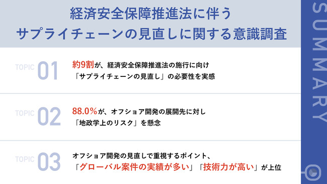 今回は、オフショア開発を実施している上場企業の経営者・役員、経営管理担当者、IT/情報システム担当者100名を対象に、経済安全保障推進法に伴うサプライチェーンの見直しに関する意識調査を実施しました。