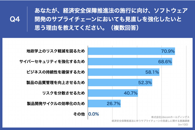 Q3で「非常にそう思う」「ややそう思う」と回答した方に、「Q4.あなたが、経済安全保障推進法の施行に向け、ソフトウェア開発のサプライチェーンにおいても見直しを強化したいと思う理由を教えてください。(複数回答)」(n=86)と質問したところ、「地政学上のリスク軽減を図るため」が70.9%、「サイバーセキュリティを強化するため」が68.6%、「ビジネスの持続性を確保するため」が58.1%という回答となりました。