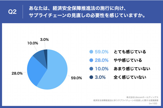「Q2.あなたは、経済安全保障推進法の施行に向け、サプライチェーンの見直しの必要性を感じていますか。」(n=100)と質問したところ、「とても感じている」が59.0%、「やや感じている」が28.0%という回答となりました。