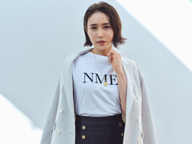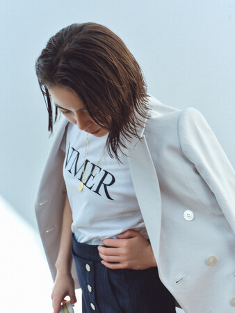 ジャケット¥47,300、Tシャツ¥12,100、パンツ¥29,700/全てNEMIKA ネックレス¥28,600/MARIHA