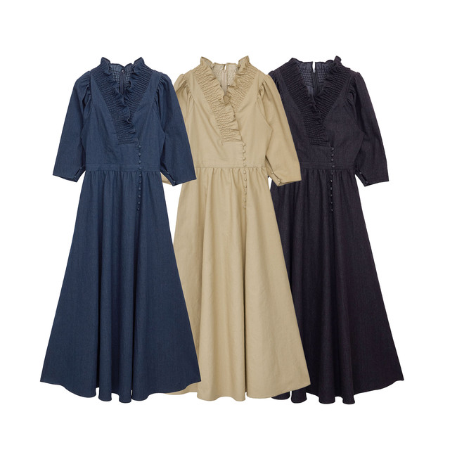 襟のシャーリングデザインがモードで女性らしいデニムドレス。