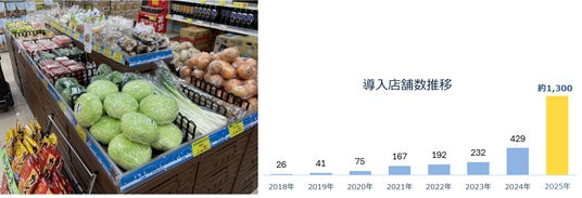 ドラッグストア内青果売場の様子(左) 青果売場構築支援サービス導入店舗数(2025年1月末現在)