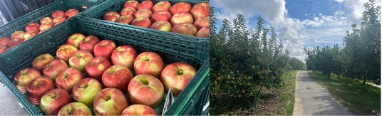 出荷前の葉とらずりんご(左) りんご農園[青森県弘前市] (右)