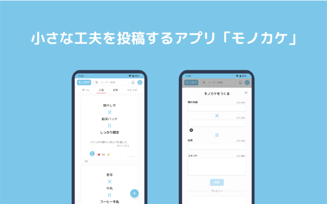 モノカケは、みんなの小さな工夫を投稿したり、発見したりする場所です。ここではあなたの日常にある小さな工夫を、結果とコメントを添えて表現するとともに他の人のモノカケを発見することもできます。