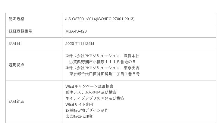 株式会社PKBソリューション(本社:滋賀県野洲市、代表取締役:山本浩史)は、ISMS(情報セキュリティマネジメントシステム)の第三者認証基準である国際規格「ISO/IEC 27001:2013」を、滋賀本社と東京支店の全営業拠点で取得した事を発表いたします。