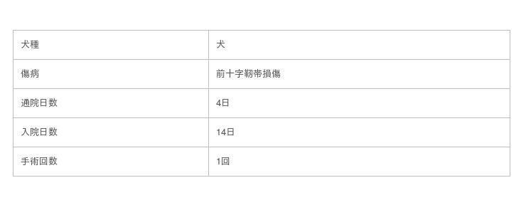 ※下記の診察内容は、犬の前十字靭帯損傷の一般的な診療内容についての記述になり、PS保険にご請求いただいた事案の診療内容とは異なります。