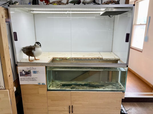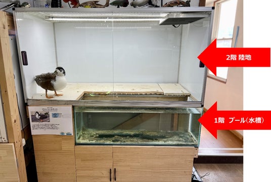 水中・陸上、2つの生活環境を用意するために、1階部分をプールにした2階建てになっています。水槽を手前に置くことで、水の中で泳ぐ姿も確認できる仕様です。