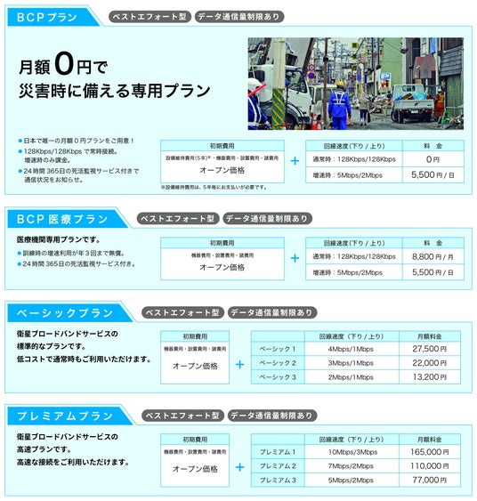 衛星通信を企業の BCP 対策や自治体・病院の災害対策として提供するとともに、お客様の声から生まれたオプションサービスを豊富なラインナップで展開しております。