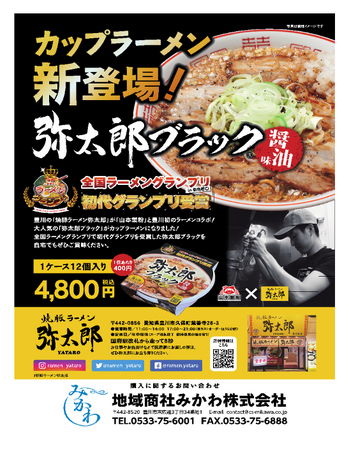 焼豚ラーメン弥太郎(愛知県豊川市)が山本製粉(愛知県豊川市)と地域商社みかわ(愛知県豊川市)と協力し5月より発売を開始しました「弥太郎ブラック」カップラーメンが僅か2ヶ月で予定販売数を完売し、豊川市ふるさと納税返礼品の維持やお客様からの追加の要望に対応する為、追加生産する事となりました。今後も地域をラーメンで色々な角度から盛り上げていきます!