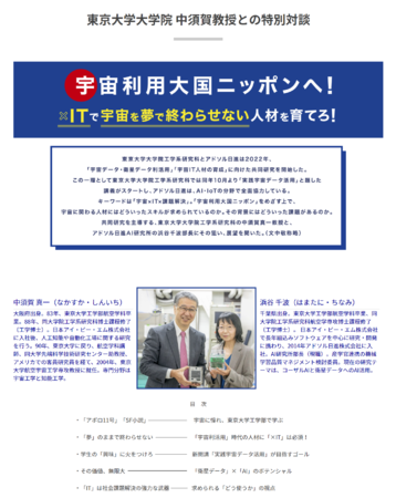 このたび、本共同研究の経緯や狙い、東京大学大学院工学系研究科で開講した新講座「実践宇宙データ活用」における取り組み等について、東京大学大学院工学系研究科・中須賀真一教授と当社AI研究所部長・浜谷千波が対談を行い、この記事の【後編】を公開いたしましたので、お知らせいたします。