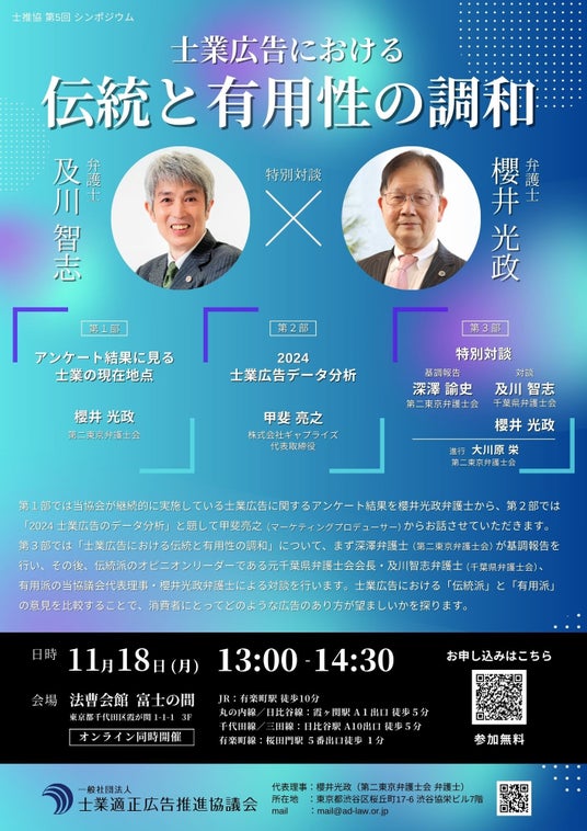 2024年11月18日(月)、一般社団法人士業適正広告推進協議会(所在地:東京都渋谷区 代表理事:櫻井光政)は、5回目となるシンポジウム「士業広告における伝統と有用性の調和」を開催させていただく運びとなりました。