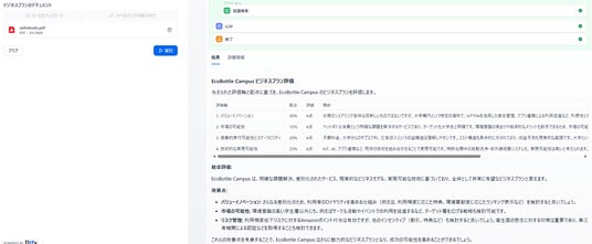 - 当サービスは、各作成資料を複数の視点から総合的に評価します。例えば、ビジネスプランでは課題の明確さ、解決策の独自性、実現可能性、収益性、社会的意義などの評価軸をルーブリックとして設定します。これにより、多角的な視点からプランの価値を判断することが可能になります。