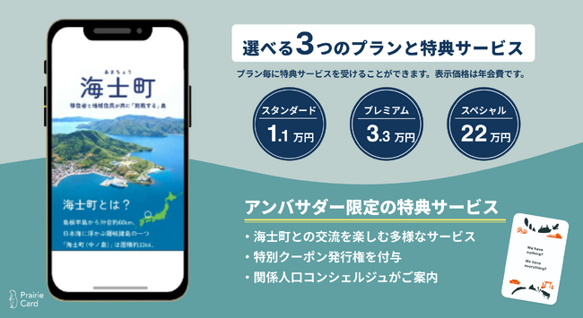 「新しい出会いの文化を創造し、コミュニケーションを豊かにする」をミッションにかかげる株式会社スタジオプレーリー(本社:東京都渋谷区、以下当社)は、島根県海⼠町(町長:大江 和彦、以下「海⼠町」)と共に、デジタル名刺サービス「プレーリーカード」を活用した取り組みである「海⼠町オフィシャルアンバサダー制度」を11月よりスタートします。