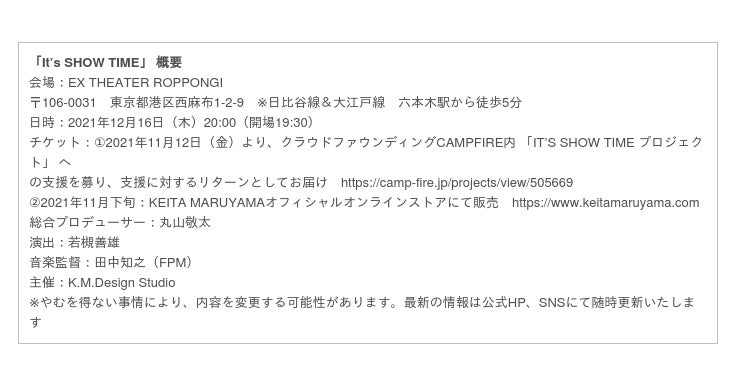 そして、11月12日(金)より、クラウドファウンディングCAMPFIRE内に 「IT’S SHOW TIME プロジェクト」 を立ち上げ、公演チケットをはじめ、限定グッズやアクティビティを支援に対するリターンとしてお届けいたします。また、公演チケットについては、後日KEITA MARUYAMAのオフィシャルオンラインストアでも販売いたします。