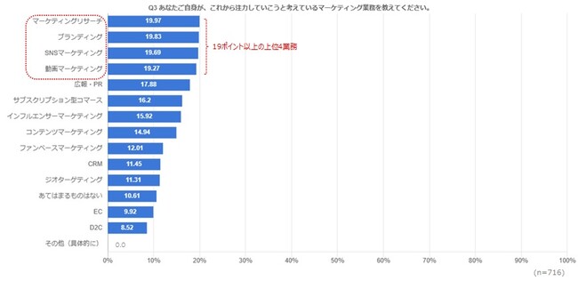 これから注力していこうと考えているマーケティング業務を聞いたところ、回答者の職種が多い「マーケティングリサーチ」(20.0%)が最も高く、次いで「ブランディング」(19.8%)、「SNSマーケティング」(19.7%)、「動画マーケティング」(19.3%)の3つがほぼ同ポイントで並ぶ結果となりました。近年注目されているマーケティング手法への積極的な姿勢が見て取れます。