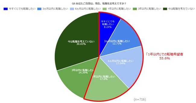 現在転職を考えているかを聞いたところ、「今すぐにでも転職したい」(8.2%)、「3カ月以内に転職したい」(12.7%)、「6カ月以内に転職したい」(17.0%)、「1年以内に転職したい」(17.6%)、「3年以内に転職したい」(14.3%)を合わせた『転職希望者』は約7割(69.8%)と圧倒的に高い結果となりました。