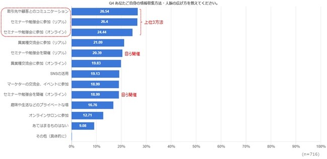 情報収集方法や人脈の広げ方を聞いたところ、業務を通じた「取引先や顧客とのコミュニケーション」(26.5%)が最も高く、「セミナーや勉強会に参加(リアル)」(26.4%)、「セミナーや勉強会に参加(オンライン)」(24.4%)が僅差で続く結果となり、リアルとオンラインでの差はほとんどなく、コロナ禍ではありますが、リアルな場も多く活用されていました。