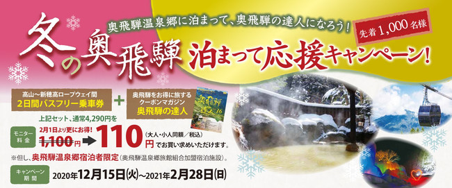 このキャンペーンは、奥飛騨温泉郷に宿泊する方限定で、高山~奥飛騨温泉郷間の路線バス2日間フリー乗車券と奥飛騨で使えるクーポンマガジン「奥飛騨の達人」をセットして、通常4,290円を1,100円のモニター価格でご利用いただけるキャンペーンを12月15日から実施していますが、2月1日より更にお得になり、110円でご利用いただけます。