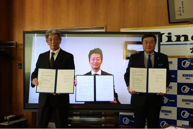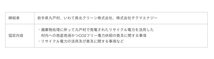 このたび、九戸村が目指す温室効果ガス排出量の削減および地域循環共生圏の構築に貢献すべく、いわて県北クリーンで発電された地産電力を中心に、タクマエナジーを通じて九戸村の公共施設へCO2フリー電力として供給することを目指すと共に、いわて県北クリーンと一体となってCO2フリー電力の普及等を通じた地域の脱炭素化を推進する協定を締結し、調印式を行いました。