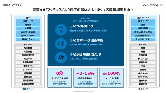 Zen office株式会社(本社:大阪府、代表取締役:岩瀬恭裕)は、人材紹介業界向けAIエージェントサービス「MENDAN」に、業界初となる音声AIマッチング機能をリリースいたします。本機能により、面談中のリアルタイムマッチングが可能となり、中堅・中小の人材紹介会社様でも大手企業並みの高精度マッチングの実現をサポートいたします。