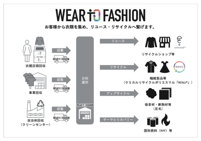 Wear to Fashionとは、『リユースとリサイクルの組合せで、廃棄される繊維・衣類を可能な限り削減し、モノの価値を最大化し、資源を循環させるためのプロジェクト』であり、2022年3月に伊藤忠商事株式会社(以下、伊藤忠商事)とecommitの業務提携により開始いたしました。