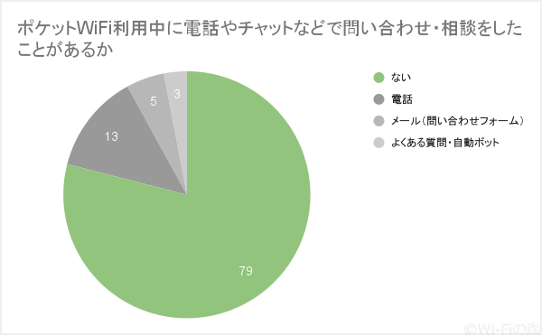 ポケットWiFiの利用中に問い合わせ・相談をしたことがないと回答した人が79人と最も多く、次いで電話での問い合わせが13人、メール(問い合わせフォーム)からの問い合わせが5人、よくある質問・自動ボットでの問い合わせが3人となりました。