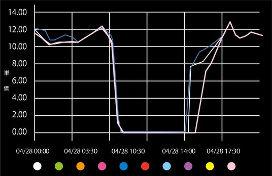 電気料金単価は電力市場価格に連動してきまっています。季節や時間によって価格も変動するのですが、お昼は安く・夜は高いなど、変動状況は年間通してある程度パターン化しています。 安いタイミングでは市場連動のメリットを取り、「今年の夏は電力単価が高騰しそうだな」といったタイミングでは価格を固定し価格高騰リスクを回避することが可能です。価格固定は時間帯、曜日、月単位、年単位といった需要家のニーズに合わせて設計ができますので自社にあった最適なプランニングが可能です。