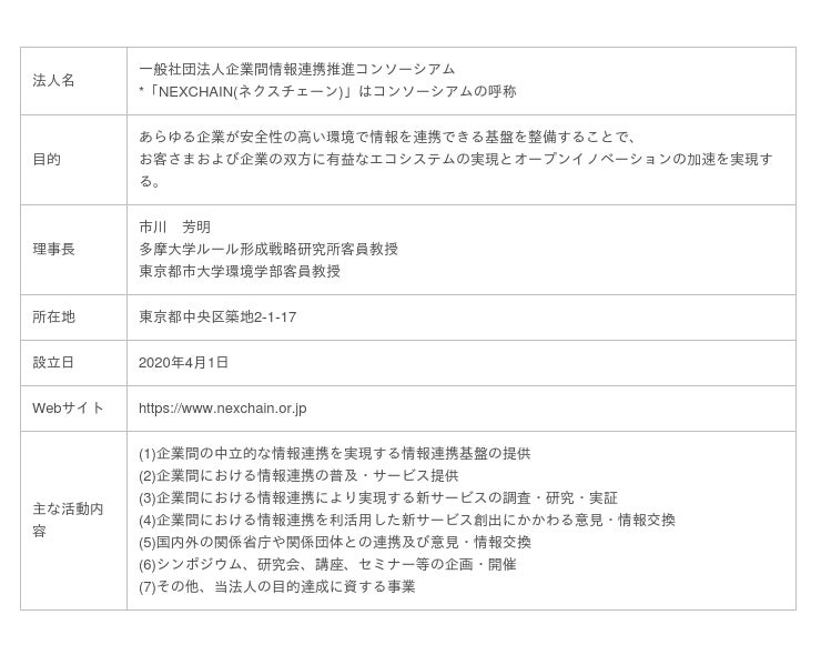 一般社団法人企業間情報連携推進コンソーシアム(理事長:市川芳明/以下、NEXCHAIN)が推進する業界の垣根を超えた創造社会の実現をめざす企業間情報連携に向けた取り組みにつき、一般社団法人日本経済団体連合会(以下、経団連)が公表する提言「Digital Transformation (DX)~価値の協創で未来をひらく~」におけるDX実装プロジェクトの一つとして推進することになりましたのでお知らせします。