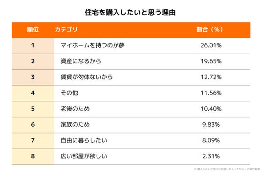 アンケート結果をカテゴライズすると、最も多かったのは「自分の家を持つことが夢だから」「庭のある家に住みたいから」といった、マイホームを持つのが夢という意見で、「思う」と回答し26.01%が該当しています。