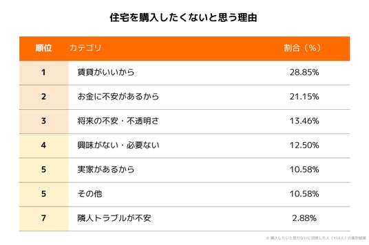 「賃貸がいいから」という意見が最も多く「思わない」と回答した28.85%がこの理由でした。