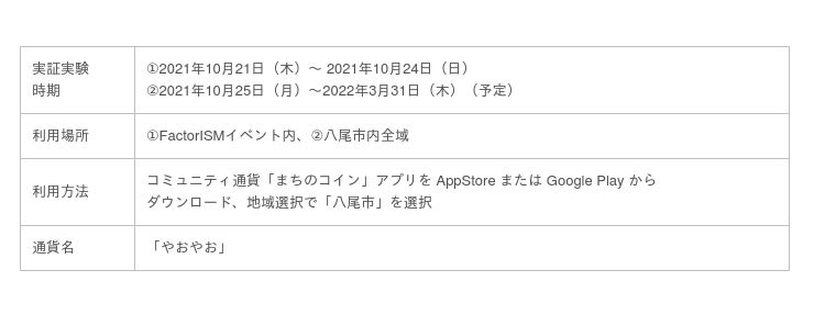 ものづくり企業以外の業種や一般市民の方の「FactorISM」への参加を促し、もっと多くの人が「モノタメ」(ものづくりエンターテイメント)を楽しみ、まちづくりに参画することで、地域活性に繋げることをめざし、FactorISMは、株式会社カヤック(本社:神奈川県鎌倉市、代表取締役CEO:柳澤大輔、東証マザーズ:3904) と協業し、大阪府八尾市エリアにて、コミュニティ通貨(電子地域通貨)サービス「まちのコイン」の実証実験を10月21日(金)から2022年3月まで予定しています。