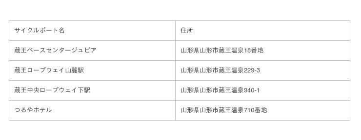 本実証実験は、スキーレンタル施設のジュピア、つるやホテル、蔵王中央ロープウェイ下駅、蔵王ロープウェイ山麓駅にサイクルポートを設営しています。本実証実験期間中は、無料でシェアサイクルを利用することが出来ます。