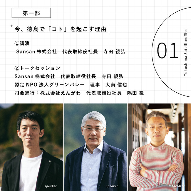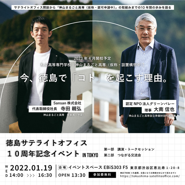 時間や場所に捉われない、新しい働き方に全社的に取り組んでいる「Sansan株式会社」代表取締役寺田氏の講演と、「日本の田舎をステキに変える!」活動に、神山で取り組んでいる認定NPO法人グリーンバレーの理事大南氏とのトークセッションをお楽しみください。サテライトオフィス開設から、「神山まるごと高専(仮称・認可申請中)」の取組みまで10年間の歩みをお二人にお話しいただきます。