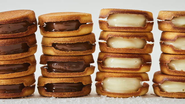 熱した鉄板で挟み焼きすることで生まれるラングドシャクッキーのカリカリ感と生チョコレートのなめらかさの両方を実現した、生チョコレートサンドクッキー。 今季より白と黒を一緒に楽しめる16個入缶も登場します。