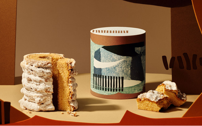 バター香る生地の層の外側にマカロン生地で包み2度焼きをすることで、しっとりとしたほどける食感とザクザクの食感を同時に楽しめる、新食感ハイブリットスイーツ、マカロンバームクーヘン。