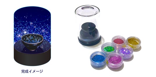 用意されたオリジナル容器に、自由にラメを入れて曜変天目茶碗のスノードームをつくろう!