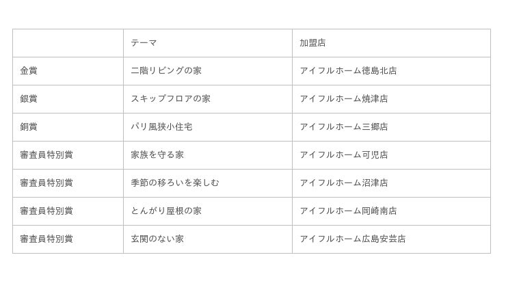 ・選考方法:応募作品は、一次審査としてアイフルホーム本部でノミネート作品を決定し、二次審査ではアイフルホーム加盟店の投票にて決定