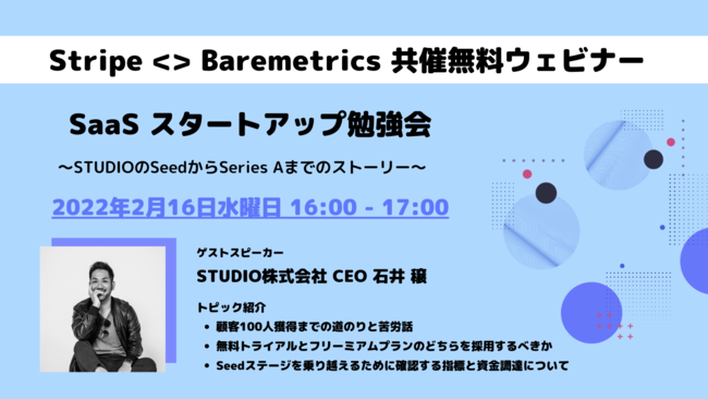 このウェビナーの目的として、日本のSaaS業界を盛り上げるため、知識を共有し合い、スタートアップを応援することとなります。今回は、ゲストとして、STUDIO株式株式のCEOの石井様を招待して、SeedステージからSeries Aまでのストーリーをメインとしてお話いただきます。