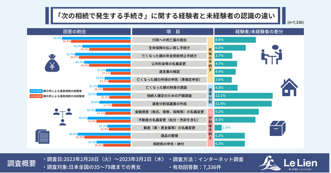 一方、経験者と未経験者で差が開いた上位3項目(複数回答)は、「相続人確定のための戸籍調査(差分12.1%)」「遺産分割協議書の作成(同11.9%)」「金融資産(株式、債券、保険等)の名義変更(同9.2%)」となっています。
