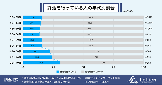 年代別に見た終活をしている人の割合は、35~64歳までは15.0%前後で推移するものの、65歳以上から増加傾向にあり、65~69歳では22.3%、70~74歳では23.9%、75~79歳では30.4%が終活を行っているという結果になりました。