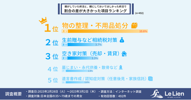 「親が生前に行っていた終活」と「親にしておいてほしかったと思う終活」の割合の差が大きかった上位5項目(複数回答)は、「物の整理・不用品処分(差分10.6%)」「生前贈与など相続税対策(同3.7%)」「空き家対策(売却・賃貸)(同3.3%)」「墓じまい・永代供養・散骨など(同2.8%)」「遺言書作成 / 認知症対策(任意後見・家族信託)(同2.6%)」となっています。