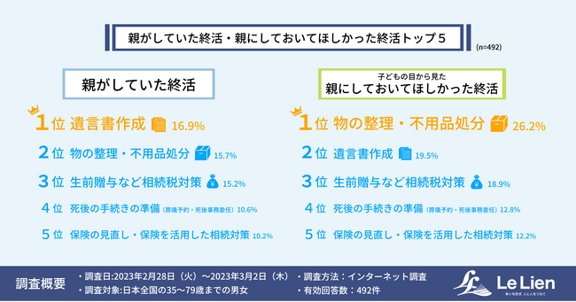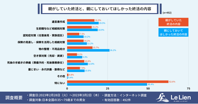 親の死による相続を経験した人に対し、「親が生前に行っていた終活」と子の目から見た「親にしておいてほしかったと思う終活」について調査した結果は以下のようになりました。