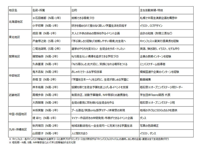 ・地区代表(◎は生徒会長、○は生徒副会長)