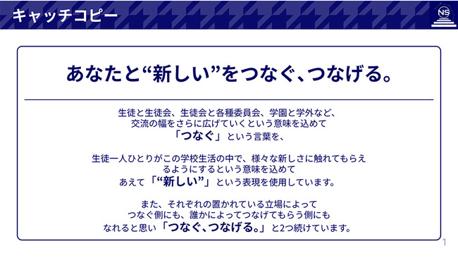 2023年10月には、全4回にわたり全生徒26,000名に向けた所信表明を行い、「あなたと“新しい”をつなぐ、つなげる。」という第2期生徒会のキャッチコピーを発表しました。また、生徒会役員と組織・部門の役割等を説明し、参加生徒との意見交換などを行いました。