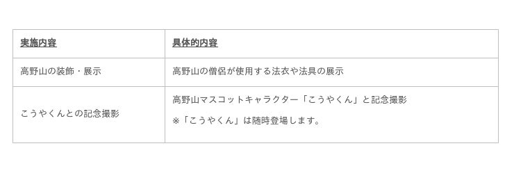 なお、本プロモーションイベントは、2023年に開催される弘法大師御誕生1250年記念大法会、2024年に世界遺産「紀伊山地の霊場と参詣道」登録20周年、更には2025年の大阪・関西万博などのビッグプロジェクトや、今後のインバウンド観光客の回復も見据え、高野山の特別な旅の魅力を首都圏の方々にも訴求し、実際に高野山まで足を運んでいただくことを目的としています。