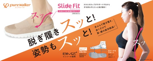 株式会社トランソニック(静岡県静岡市)は、当社フットウェアブランドのpure walker(ピュアウォーカー)より、ハンズフリー機能のSlide Fit(スライドフィット)と高機能インソールであるBMZインソールを搭載した新商品を発売しました。